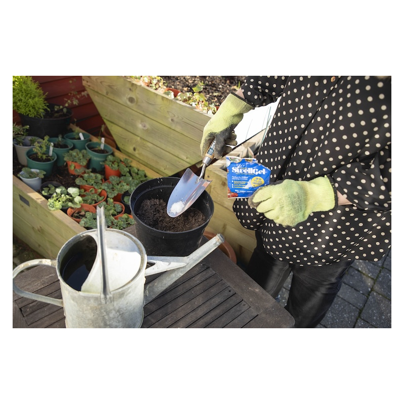 Reduces watering, improves plant quality, flower production and productivity of dry soils. Add water gel to soil before planting to aid water retention in hanging baskets, containers and pots